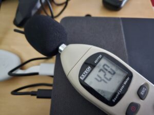 Als ik mijn decibelmeter op de projector plaats terwijl deze in werking is, meet ik iets meer dan 40 dB en hoor ik een lichte brom. Als ik de decibelmeter 1m verder weg zet, pikt hij alleen het restgeluid in de kamer op, dus deze projector is erg stil.