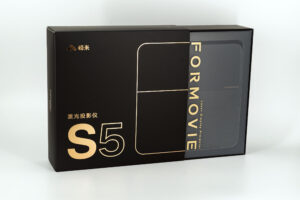 De doos van de Formovie S5 is sober en elegant en de keuze voor zwart met gouden letters geeft een indicatie van de positionering van het merk. Dit is verre van een standaard Chinees product. De doos gaat niet open zoals de meeste, je moet de kartonnen verpakking eruit schuiven om bij de inhoud te komen, en de inhoud wordt nog steeds beschermd door een dikke laag plastic.