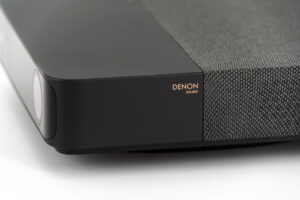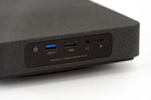 Er zitten geen knoppen aan de zijkanten en de projector maakt gebruik van twee soorten materiaal: zwart plastic voor de voorkant en stof voor de achterkant om hem een iets luxueuzere uitstraling te geven. De stof dient waarschijnlijk geen ander doel, want het geluid komt uit de onderkant van de projector, terwijl stof vaak wordt gebruikt om de luidsprekers op andere projectoren te verbergen. Formovie koos voor Denon voor de luidsprekers en je zult later in de test meer zien of horen over de resultaten.